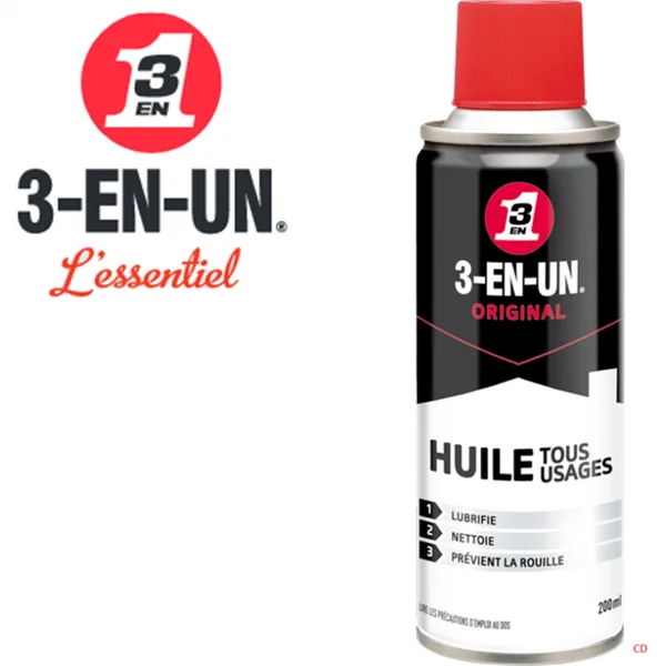 HUILE MULTI USAGES 3 EN 1 AEROSOL 200ML :Caractéristiques :-Huile 3 en 1, spray de 200Ml.-Plage de température dutilisation: -30° à 100°C.*LES HUILES MULTI-USAGES :-3-EN-UN® ORIGINAL, cest lhuile célèbre et authentique qui convient à de multiples utilisations.-Sa formule à base dhuile minérale permet de lubrifier efficacement les mécanismes, supprimer les grincements, nettoyer le métal, tout en les protégeant de la rouille et la corrosion.-Lhuile 3-EN-UN® ORIGINAL est simple et efficace partout dans la maison, que ce soit pour les gonds de porte, le vélo ou la machine à coudre.-Sa disponibilité en burette permet des applications précises et rend possible les applications au goutte à goutte sans projection extérieure.*Attention ! Aérosol extrêmement inflammable.Bien lire les précautions d’emploi avant usage.