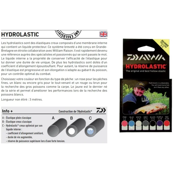 Hydrolastic Daiwa Match Winner Violet Les hydrolastics sont des élastiques creux composés d’une membrane interne qui contient un liquide protecteur. Ce système breveté a été conçu en Grande- Bretagne en étroite collaboration avec William Raison. Il est rapidement devenu une référence auprès des spécialistes et passionnés qui se sont passés le mot. Le liquide interne a la propriété de conserver l’efficacité de l’élastique pour lui donner une durée de vie unique. De plus les hydrolastics sont dotés d’un coefficient d’allongement époustouflant. Pour autant, la réserve de puissance de l’élastique est progressive et son élongation s’adapte au gabarit du poisson, pour un contrôle optimal du combat. Choisissez votre couleur en fonction du type de pêche : un rose pour les pêches fines, un blanc ou encore gris pour le tout-venant et un rouge ou brun pour la recherche des gros poissons comme la carpe. Le jaune est le dernier né de la série et permet d’améliorer les performances lors de la recherche des poissons blancs. Longueur non étiré : 3 mètres. Avis Hydrolastic Daiwa Match Winner Violet Écrivez votre avis