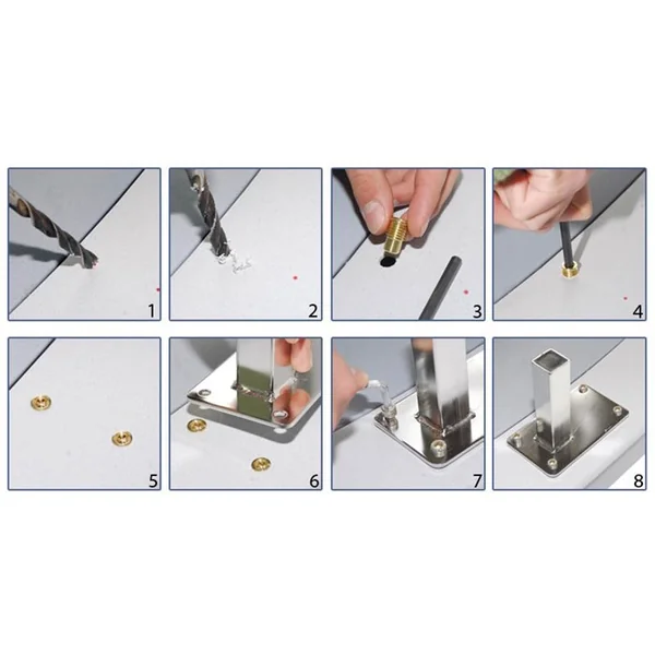 Utiliser un foret diamètre 10 de préférence un foret bois ou plastique, percer votre barque de peche, positionner l’insert avec une clé alêne visser l’insert dans le bateau jusqu’à ce que la tête soit au ras de votre coque.