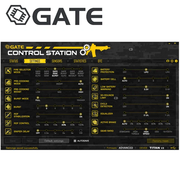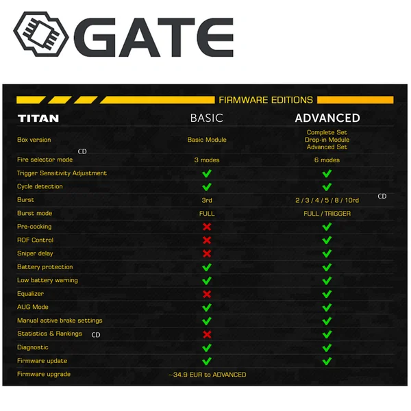 KIT COMPLET GATE BLOC DETENTE TITAN V3 :Caractéristiques :-Kit complet pour profiter de tous les avantages de GATE TITAN.-TITAN V3 est un système de gestion/contrôle de votre AEG pour Gearbox V3 qui transformera complétement votre réplique en un système efficace et réglable.-Ajustez votre AEG et vérifiez les statistiques à l’aide de l’application USB-Link et GATE Control Station pour les appareils PC et Android.-TITAN V3 vous permet d’ajuster la sensibilité de la détente avec une précision militaire.-Les capteurs de détente innovants vous offrent même 250 réglages possibles.-Bénéficiez d’un avantage tactique grâce à la réponse de déclenchement extrêmement rapide et à de nombreuses autres fonctions utiles. -Offrez à votre AEG une nouvelle vie !*Le kit comprend :-USB-Link pour l’application « GATE Control Station ».-Câbles USB :-USB-A à Micro-USB (1.5m / 4ft 11in) -USB-C à Micro-USB (0.6m / 1ft 11in)-Micro-USB à Micro-USB (0.6m / 1ft 11in)-Kit d’installation.-Guide de démarrage et d’installation.*Pourquoi le GATE TITAN est-il si spécial ? -Il a une configuration simplifiée via l’application GATE Control Station pour Android, Windows et macOS.-C’est le premier et le seul mosfet permettant de faire des mises à jour du firmware via internet, ce qui permet des améliorations.-Il possède un capteur de détente qui vous offre même 250 paramètres de réglages possibles.-Il a des capteurs optiques innovants à la place des contacteurs mécaniques qui peuvent présenter des défauts.-Il vous donne un accès aux statistiques et classements (en cas de firmware avancé).-Il possède une réactivité/réponse de déclenchement identique à une vraie arme.-Il est compatible avec DSG, SSG et pistons à 19 dents.-Il est compatible avec la plupart des Gearbox V3 (y compris les cnc) sur le marché sans aucune modification.-Il est compatible avec les répliques AEG les plus puissantes. *GATE Control Station -TITAN et GATE Control Station vous donnent le contrôle total de votre AEG. Le GCS vous offre l’option de :-Contrôlez votre réplique depuis votre smartphone avec Android et PC, avec Windows ou macOS.-Il suffit d’ajuster les paramètres du TITAN.-Simplicité pour les mises à jour.-Voir les statistiques et participer aux classements.-Effectuer des diagnostics et envoyer des rapports.*Uniquement en cas de firmware avancé.*Voir Vidéo de Présentation : https://youtu.be/Gy4Md415wZ0*Voir Vidéo de Présentation Réglage de la détente, Partie 1: https://youtu.be/Tu5GXJ3w9N8*Voir Vidéo de Présentation Selecteur de tir : https://youtu.be/eheE87gbavs*Voir Vidéo de Présentation de Réglage de la détente, Partie 2 : https://youtu.be/oFdexZfS-fE Normal 0 21 false false false FR X-NONE X-NONE /* Style Definitions */ table.MsoNormalTable {mso-style-name: »Tableau Normal »; mso-tstyle-rowband-size:0; mso-tstyle-colband-size:0; mso-style-noshow:yes; mso-style-priority:99; mso-style-parent: » »; mso-padding-alt:0cm 5.4pt 0cm 5.4pt; mso-para-margin-top:0cm; mso-para-margin-right:0cm; mso-para-margin-bottom:10.0pt; mso-para-margin-left:0cm; line-height:115%; mso-pagination:widow-orphan; font-size:11.0pt; font-family: »Calibri », »sans-serif »; mso-ascii-font-family:Calibri; mso-ascii-theme-font:minor-latin; mso-hansi-font-family:Calibri; mso-hansi-theme-font:minor-latin; mso-fareast-language:EN-US;}