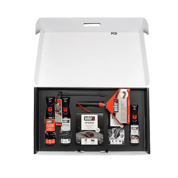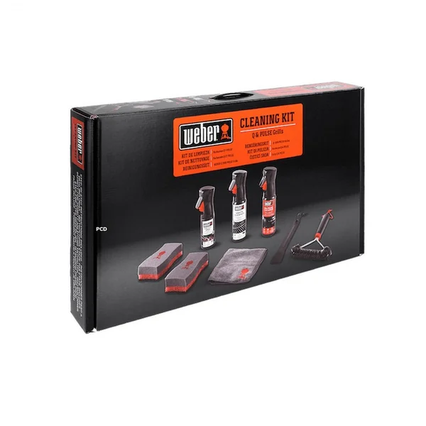 Composition : un nettoyant Q et Pulse 300ml Weber; un nettoyant Pour Grilles De Cuisson 300ml Weber; une huile Anti Adhérence 200ml Weber; un lot De 2 Eponges Weber, un grattoir Weber, une brosse à trois côtés et un chiffon en microfibre.