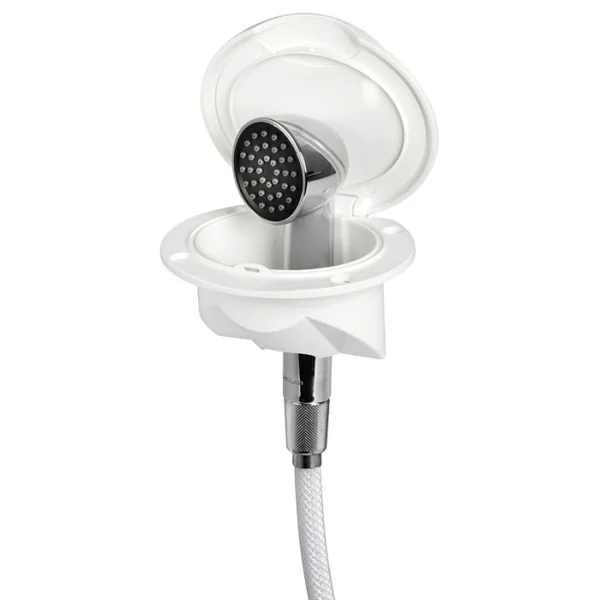 Boîtier avec insert en acier inox AISI316. Inclinaison à 45° pour installation à plat ou verticale. Douchette Keji avec tête surdimensionnée.