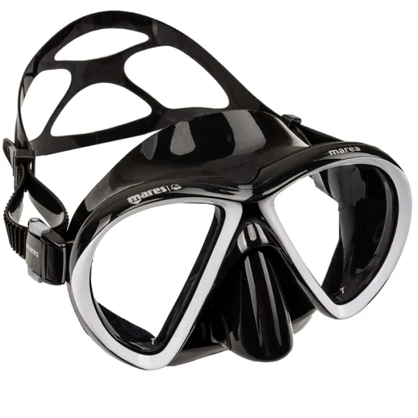 Les boucles de réglage, intégrées à la pièce faciale, sont faciles à utiliser, et le verre spécial du masque offre un large angle de vue vers le bas, garantissant une grande visibilité sous l’eau.