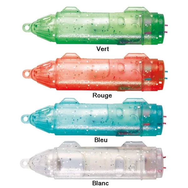 Grace à son passe fil, il est possible de la placer sur votre ligne près de vos appâts ou de vos leurres afin d’optimiser vos résultats de manière significative. Grace à son clignotement visible à de grandes distances, sa forte luminosité attire calamars et poissons dans l’obscurité des grands fonds (jusqu’à 300 mètres).