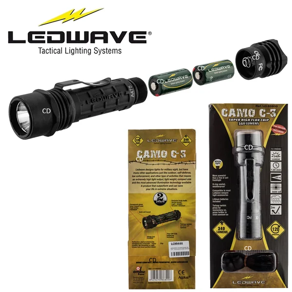 LAMPE LEDWAVE C-3 NOIR 535 LUMENS : Caractéristiques :-Lampe Ledwave compact et résistante aux chocs.-Ledwave Lampe C-3 noir 535 lumens, Anti choc/Anti Humidité.-Robuste.-Très bon rapport qualité/prix.-Puissante et compacte.-La lampe tactique C3 de Ledwave est destinée aux militaires, forces de police, agents de sécurité ainsi qu’un public plus large de randonneurs, chasseurs, etc-Son corps en polymère spécial haute résistance est quasiment indestructible pour un poids très réduit.-Lampe offrant un rapport poids/puissance idéal.-Elle est livrée avec 2 pile CR123.-Dimensions : 14cm.