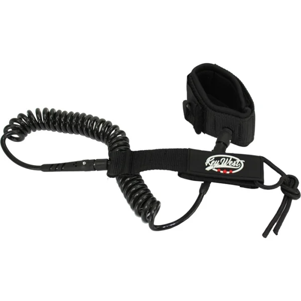 Leash paddle Stand up paddle Key West Universel Black 9.0 Grâce à son cordon en forme de spirale, le leash de SUP Key West est plus court en apparence mais retrouve toute sa longueur une fois tendu. Il est, de ce fait, moins encombrant qu’un leash droit de surf et ne trainera pas dans l’eau.