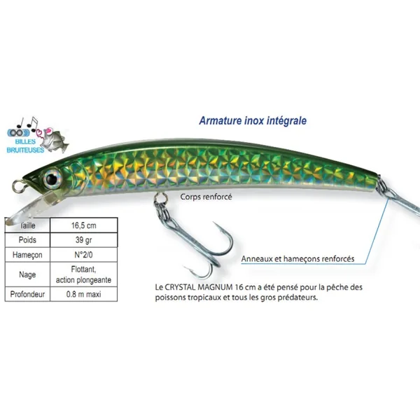 Leurre Crystal Magnum Yo-Zuri 16 cm Armature inox intégrale. Le CRYSTAL MAGNUM 16 cm a été pensé pour la pêche des poissons tropicaux et tous les gros prédateurs.