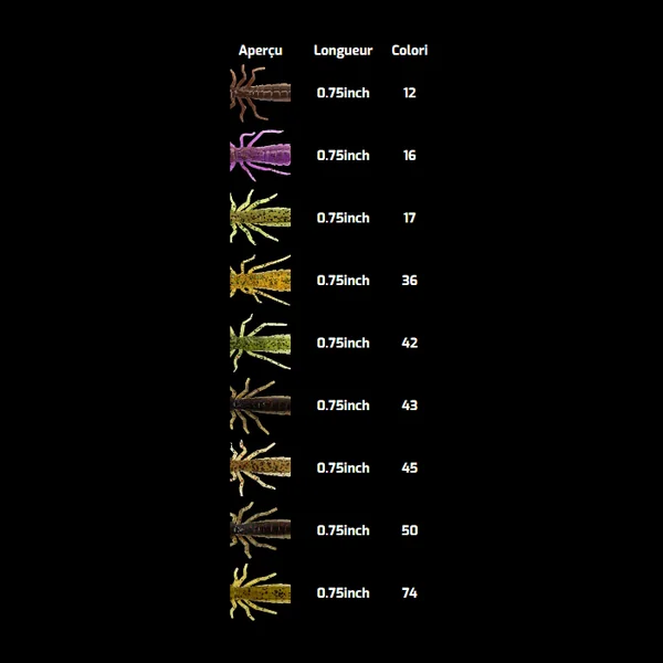 La qualité du silicone de FISHUP permet véritablement de combiner une grande souplesse et une finition réaliste. Au contact de l’eau, les minuscules frétillements des pattes imitent parfaitement les mouvements d’une larve créant un véritable effet vivant tout à fait redoutable pour déclencher l’attaque des prédateurs !