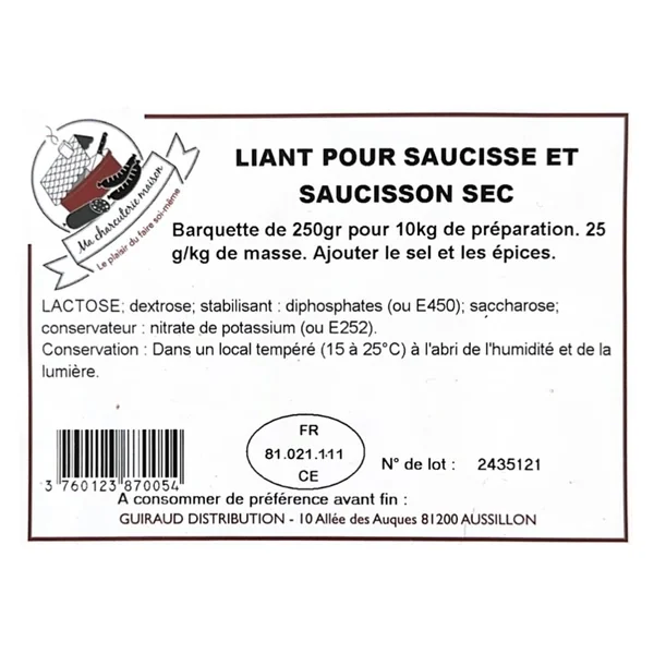 Le liant pour saucisses et saucissons secs de Guiraud Distribution est un mélange à ajouter à vos préparations de saucisses et saucissons. Ce mélange vous permettra d’éviter que se forment des creux à l’intérieur de vos charcuteries et ainsi éviter les moisissures.