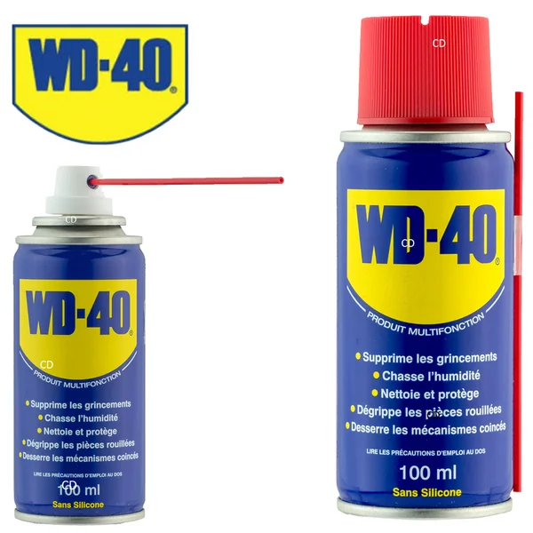 LUBRIFIANT WD-40 EN SPRAY 100ML :Caractéristiques :-Connu comme étant « laérosol aux milliers dusages », WD-40 protège le métal de la rouille et la corrosion, libère les mécanismes bloqués, repousse lhumidité et lubrifie les petits mécanismes comme les grandes surfaces.-WD-40 est également un excellent produit nettoyant, en particulier pour éliminer les taches de graisse, de goudron ou autres marques sur la plupart des matières !-Les 4 fonctions : – Chasse lhumidité – Lubrifie – Protège Nettoie.-Idéal pour l’entretien : des armes à feu, des couteaux et des outils.-Produit multifonction : supprime les grincements, dégrippe les pièces rouillées et desserre les mécanismes coincés.-En spray, 100ml.*DANGER ! Aérosol extrêmement inflammable.Bien lire les précautions d’emploi avant usage.
