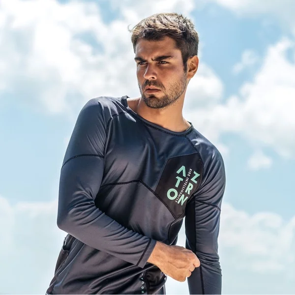 Lycra Aztron LS Homme Le Lycra à manches longues nouvellement introduit Aztron s’adapte comme un tee-shirt normal, mais est construit avec notre tissu rash guard haut de gamme. Ce matériau suprême assure une protection solaire UPF 50+ douce et soyeuse avec un ajustement extrêmement confortable.