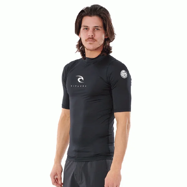 Lycra homme Rip Curl manches courtes – Noir – S Ce t-shirt en Lycra manches courtes est une tenue de surf pour homme. Il est confectionné en tissu durable en poly-élasthanne et taillé pour la performance. Il offre une protection UV certifiée UPF 50+ grâce à sa matière haute qualité.