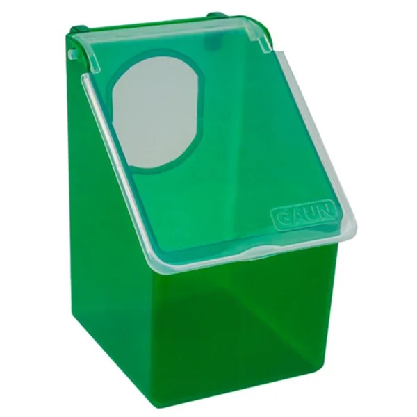 Cette mangeoire permet au pigeon élevé en cage de s’alimenter sans gaspiller. En effet, pour atteindre les graines, il doit passer la tête dans le trou de la mangeoire et ne peut pas faire sortir les graines de la mangeoire autrement qu’en les mangeant.