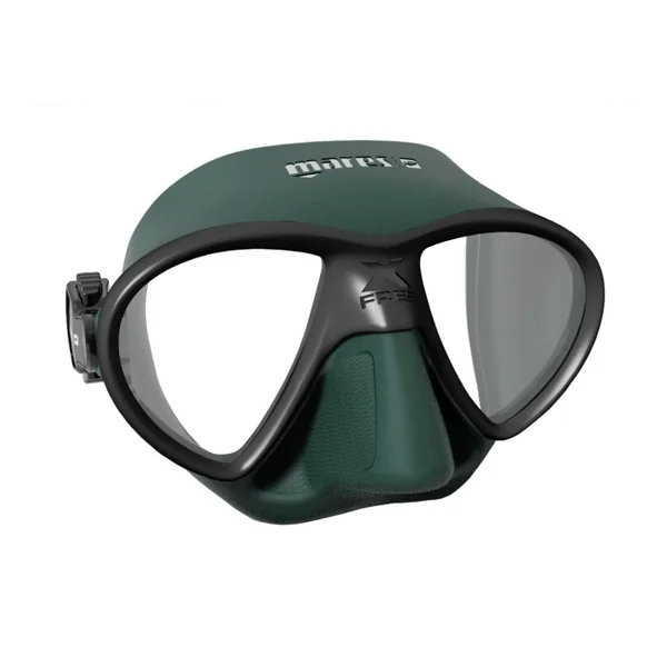 Masque Mares X-Free Green Cerclage surmoulé et jupe anatomique • Distance réduite entre les yeux et les verres • Volume interne réduit, moins de 80 cm3 • Large champ de vision • Très léger • Finition mate antireflets • Profil hydrodynamique qui réduit la résistance dans l’eau • Boucles du masque ergonomiques pour une utilisation facile • Zone de préhension en relief sur le nez, pour une adaptation parfaite avec un pince nez • Le nouveau silicone utilisé pour la jupe réduit la formation de buée.