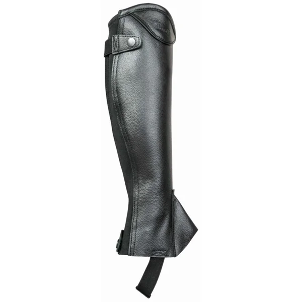 Ces mini-chaps T de T sont des chaps noires imaginées pour apporter un maximum de confort au cavalier et au cheval. Elles permettent une grande liberté de mouvement de la cheville mais aussi un bon maintien grâce au renfort en haut de la jambe. Le cuir de ces chaps de taille adulte est un cuir grainé souple et résistant qui permet de se conformer parfaitement à la jambe du cavalier. La fermeture se fait par un zip YKK qui se trouve à l’arrière et qui est sécurisé par pression en haut et en bas de la tige.