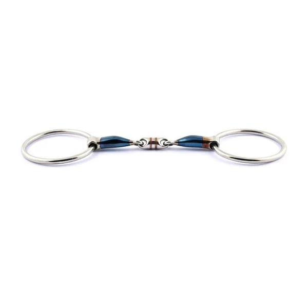 Composition : Blue Steel (54% de carbone et 46% de manganèse). Taille : 125 à 135cm. Conseil d'utilisation : Embouchure la plus canalisante, elle est la meilleure aide pour les problèmes directionnels. Cet alliage va s'oxyder avec le temps et donc rouiller, ce qui favorisera la décontraction du cheval dans le travail. Les incrustations en cuivre ainsi que les anneaux de cuivre sur la brisure centrale permettent également de favoriser la décontraction en bouche. Conseil d'entretien : Bien rincer le mors après chaque utilisation afin de limiter le dépôt de résidus et d'engendrer un inconfort pour votre cheval.