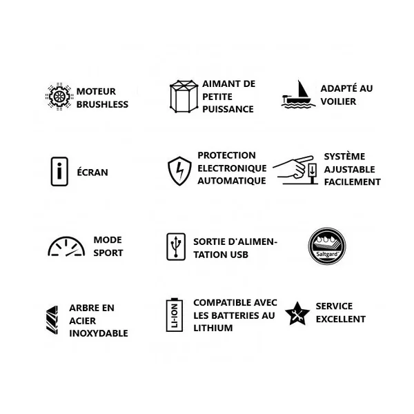 Moteur hors-bord électrique puissant avec une traction de 70lbs à une tension de 12V, ce qui correspond à environ 1500W.