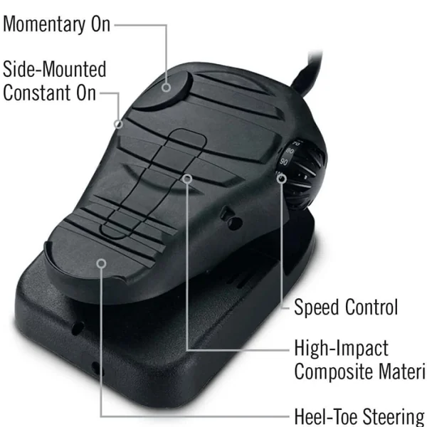 Grâce à cette pédale vous pourrez contrôler entièrement votre moteur d’une simple pression du pied. Ce système extrêmement fiable et réactif possède l’avantage de vous laisser les mains totalement libres pour tenir une canne à pêche par exemple. Cette pédale fonctionne sans piles, elle est reliée au moteur par un câble électrique.