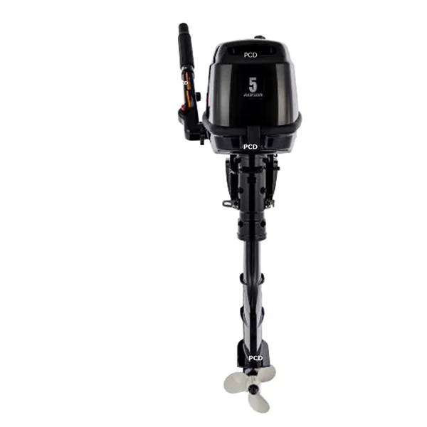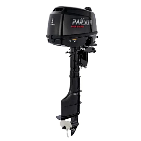 Moteur thermique, de marque Parsun, d’une puissance de 5 CV, avec arbre long et barre franche.