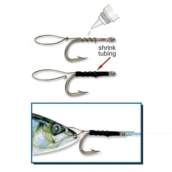 La bague est vissée directement sur l’hameçon, bloquée définitivement avec une goutte de colle cyanoacrylate et protégée par une gaine rétractable noire incluse dans le sachet.