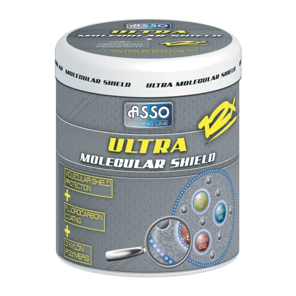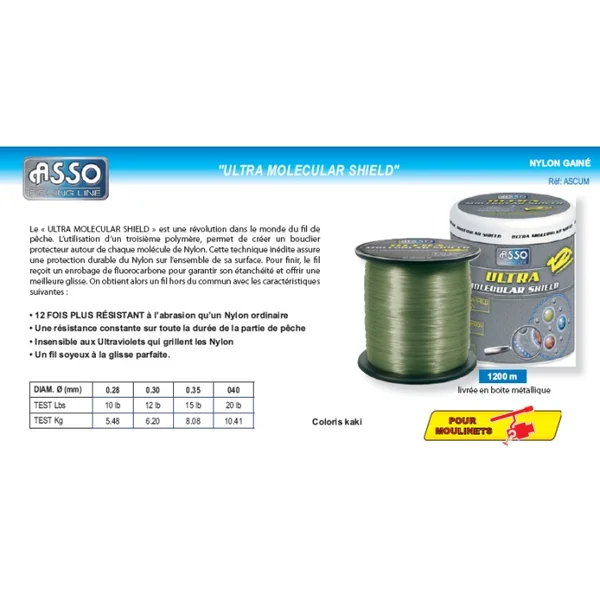 Nylon Asso Ultra Molecular Shield 1200 m 28/100 Le « ULTRA MOLECULAR SHIELD » est une révolution dans le monde du fil de pêche. L’utilisation d’un troisième polymère, permet de créer un bouclier protecteur autour de chaque molécule de Nylon. Cette technique inédite assure une protection durable du Nylon sur l’ensemble de sa surface. Pour finir, le fil reçoit un enrobage de fluorocarbone pour garantir son étanchéité et offrir une meilleure glisse. On obtient alors un fil hors du commun avec les caractéristiques suivantes :