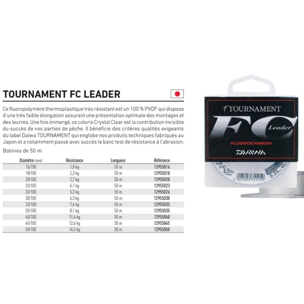 Nylon Daiwa Fluoro FC Leader Ce fluoropolymère thermoplastique très résistant est un 100 % PVDF qui dispose d’une très faible élongation assurant une présentation optimale des montages et des leurres. Une fois immergé, ce coloris Crystal Clear est la contribution invisible du succès de vos parties de pêche. Il bénéficie des critères qualités exigeants du label Daiwa TOURNAMENT qui englobe nos produits techniques fabriqués au Japon et a notamment passé avec succès le banc test de résistance à l’abrasion. Avis Nylon Daiwa Fluoro FC Leader Écrivez votre avis