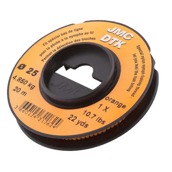 Nylon JMC DTK Orange 20 M Ces fils teintés dans la masse permettent de pêcher au fil et de visualiser la plus discrète des touches. Il est conseillé d’associer plusieurs couleurs pour une détection parfaite dans toutes les conditions de luminosité. Caractéristiques Nylon JMC DTK Orange 20 M