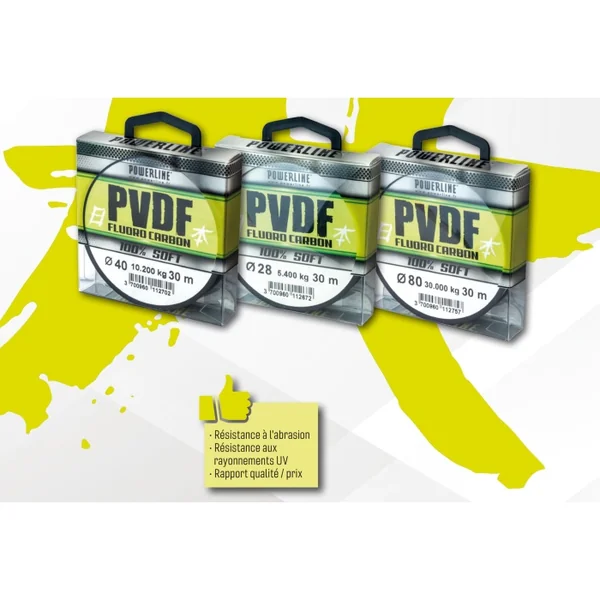 Nylon Powerline PVDF 30M Ø30 6.20KG Le PVDF est un fluoro carbon avec une très bonne résistance mécanique et une très bonne tenue à l’abrasion malgré une densité plus faible comparée aux autres fluoropolymères.