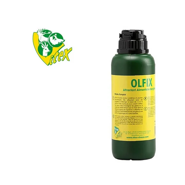 OLFIX VITEX EN BOUTEILLE DE 500G PAR 6 :Caractéristiques :-Arôme liquide (saveur protéines et plantes aromatiques) très attractant pour les sangliers en jerrican de 5Kg.*Mode d’emploi :-A mélanger à raison de 1 à 2% dans le maïs quelques jours avant utilisation pour mieux imprégner les grains ou à verser en même temps que le maïs dans la réserve à grains de l’agraînoir.-Le complément idéal quelle que soit la saison.-PACK de 6 bouteilles de 500g.-Pour de grosses quantités merci de nous contacter !*DANGEREUX ! Respecter les précautions demploi.