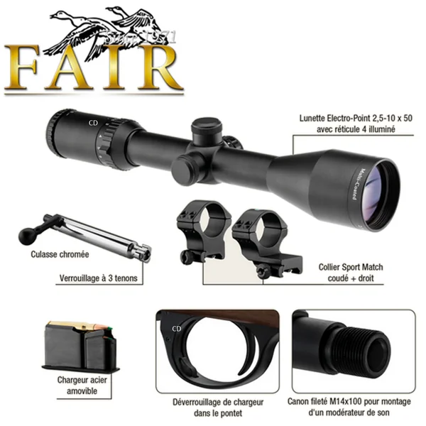 PACK COMLET AFFUT CARABINE FAIR FILETEE 308WIN :*Garantie 5 ans.*Ce pack Affût FAIR comprend :-1 Carabine à verrou FAIR, à canon fileté, calibre 308WIN. -1 Lunette Electro-Point 2,5-10 x 50, avec réticule 4 illuminé.-Embases et colliers de montage. -et 1 Fourreau FAIR noir 122cm.*A savoir sur la Carabine Fair Grande Chasse Canon fileté :-Carabine à répétition, à verrou chromé à 3 tenons.-Canon fileté avec organes de visée.-Guidon fibre optique rouge.-Chargeur amovible.-Levier darmement à boule.-Crosse en bois poncé huilé avec plaque de couche caoutchouc.-2 grenadières pré-montées.*Le verrouillage à 3 tenons permet deux avantages :-Une répartition plus homogène de la pression pour plus de sécurité.-Une réduction de langle de verrouillage, ce qui permet un réarmement plus rapide grâce une amplitude réduite du mouvement.*Caractéristiques techniques :-Calibre 308Win.-Nombre de coups : 4 (3+1).-Longueur du canon : 56cm.-Filetage : M14X100.-Poids (carabine seule ): 3kg300.-Poids du pack : 4kg000. -Catégorie C.*Prix de vente conseillé 2018 : 1380€.*ARME SOUMISE A LA LEGISLATION : Carte d’identité + Permis de chasse OU Licence de tir valides OBLIGATOIRES.*AUCUNE LIVRAISON NE POURRA INTERVENIR SANS PIECES JUSTIFICATIVES. Normal 0 21 false false false FR X-NONE X-NONE /* Style Definitions */ table.MsoNormalTable {mso-style-name: »Tableau Normal »; mso-tstyle-rowband-size:0; mso-tstyle-colband-size:0; mso-style-noshow:yes; mso-style-priority:99; mso-style-parent: » »; mso-padding-alt:0cm 5.4pt 0cm 5.4pt; mso-para-margin-top:0cm; mso-para-margin-right:0cm; mso-para-margin-bottom:10.0pt; mso-para-margin-left:0cm; line-height:115%; mso-pagination:widow-orphan; font-size:11.0pt; font-family: »Calibri », »sans-serif »; mso-ascii-font-family:Calibri; mso-ascii-theme-font:minor-latin; mso-hansi-font-family:Calibri; mso-hansi-theme-font:minor-latin; mso-fareast-language:EN-US;}