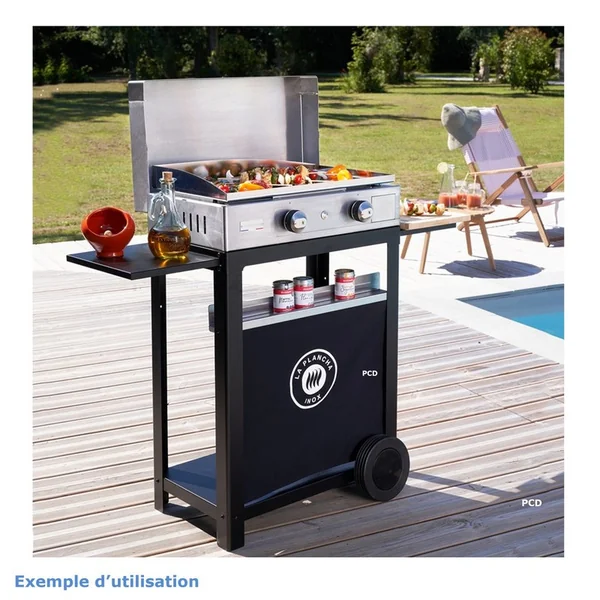Découvrez cette plancha gaz Le Marquier avec chariot, couvercle, porte épices et rideau inclus.