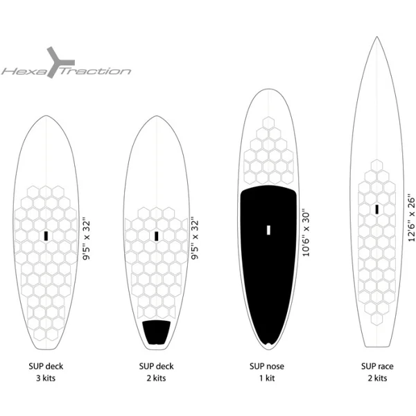 Le kit est composé de 18 hexagones complets et 4 demi-hexagones de 16cm (6,3″) et d’un gabarit d’installation en forme d’étoile HexaTraction. Caractéristiques Pad SUP/Surf RSPRO HexaTraction Blanc