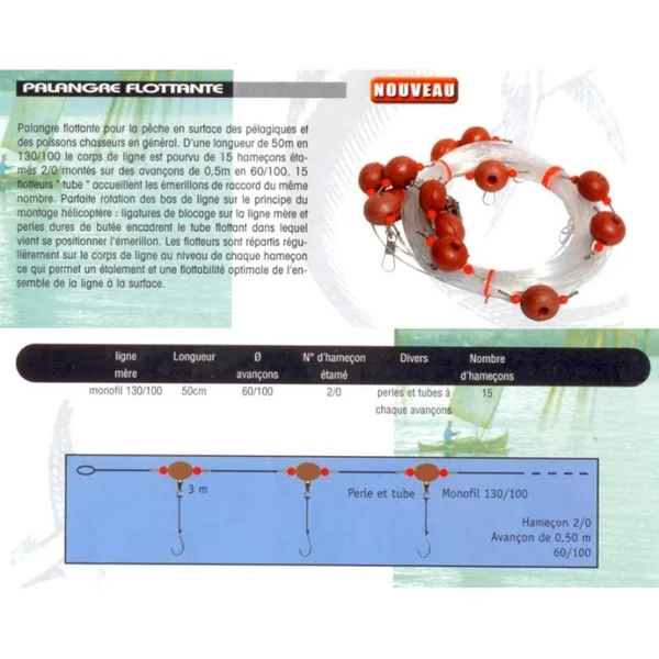 Palangre de pêche flottant F50 Cette palangre de pêche flottant convient à tous les poissons (bars, maquereaux…). Les appâts seront des languettes de maquereaux ou d’encornets, mais aussi des lançons vivants-