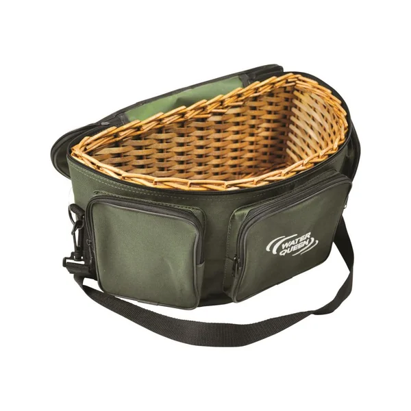 Ce panier en osier recouvert d’une toile et d’un couvercle zippable, dispose de 3 poches sur l’avant, pour ranger pochettes d’hameçons, boites de plombs et autres accessoires de pêche.