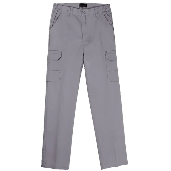 Composition : 100% coton Twill. Ce pantalon contient une taille élastiquée. Une fermeture à glissière. Différentes poches. Coloris : gris. Tailles : du 40 au 50. Conseil d'entretien : laver en machine à 30°. Mettre avec des couleurs simialires. Laver et repasser à l'envers. Ne pas utiliser de javel.