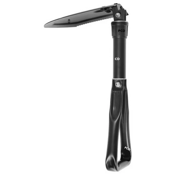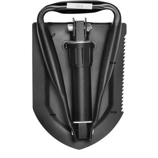 Pelle avec manche pliable, bord de lame dentelée pour scier, virole de sécurité pour maintenir la pelle ouverte ou fermée.