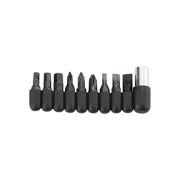 Principaux outils : démanilleur, 2 lames de 7,5 cm dont une crantée, lame scie, porte embouts de vissage + 9 embouts