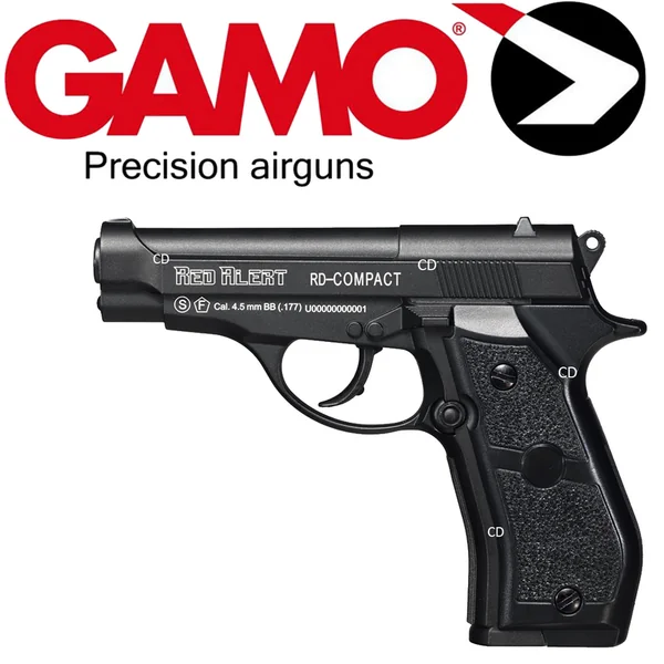 PISTOLET GAMO RED ALERT RD-COMPACT :Caractéristiques :-Pistolet à air comprimé calibre 4.5mm BB S, de marque Gamo.-CO2.-Capacité : 20 coups.-Poids : 790g environ.-Vitesse : 131m/s.-Puissance inférieure à 10 joules. (3 joules).*Prix de vente conseillé en 2017 : 91€.*PISTOLET SOUMISE A LA LEGISLATION : CARTE D’IDENTITE OBLIGATOIRE.
