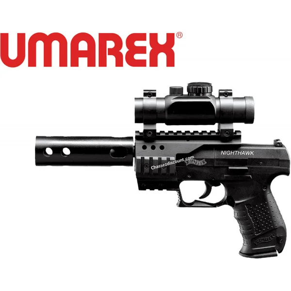 PISTOLET NIGHT HAWK VISEUR POINT ROUGE UMAREX : Caractéristiques : -Pistolet à CO2 calibre 4.5mm, -Longueur : 24.8cm, -Poids : 960g environ, -Capacité : 8, -Viseur point rouge walher. -Puissance inférieure à 3 joules. *Prix de vente conseillé en 2015 : 289 euros. PISTOLET SOUMISE A LA LEGISLATION : CARTE D’IDENTITE OBLIGATOIRE.