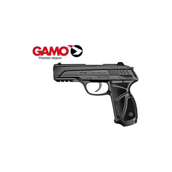 PISTOLET PT85 BLOWBACK GAMO : Caractéristiques : -Pistolet à air comprimé calibre 4.5mm, -Longueur : 19.8cm, -Poids : 750g environ, -Vitesse : 125 m/s. -Puissance inférieure à 10 joules. (3.98 joules). *Prix de vente conseillé en 2016 : 174 euros. PISTOLET SOUMISE A LA LEGISLATION : CARTE D’IDENTITE OBLIGATOIRE.