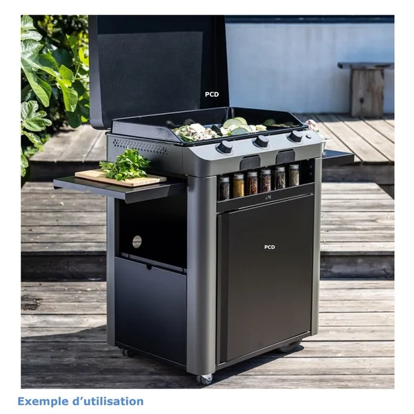 Découvrez cette plancha gaz sur chariot en acier galvanisé thermolaqué de la marque française Eno, équipée d’une plaque en fonte émaillée avec le trou de récupérateur de graisse qui vous permettra des cuissons de vos mets préférés à la perfection.