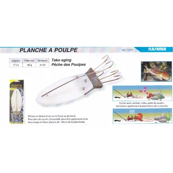Cette planche a été spécifiquement conçue pour pêcher les poulpes. Grace à l’emplacement spécifique de la plombée, elle se pose systématiquement sur le fond pointes vers le haut, limitant ainsi les accroches. La tige centrale servira à maintenir parfaitement en place un appât (sardine, crabe, patte de poulet). Du bord, après avoir lancé, il suffit de réccupérer lentement la planchette sur le fond.