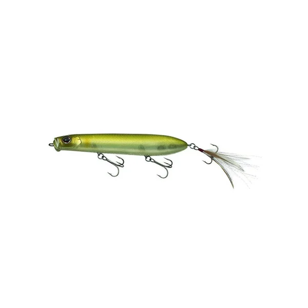 Ce poisson nageur Evregreen Showerblows Shorty est le petite modèle que la marque japonaise propose. Avec ses 10,5cm pour un poids à peine supérieur à 16g, il naviguera à la surface de l’eau grâce à une action très intéressante de walking the dog, tout en envoyant des signaux sonores.