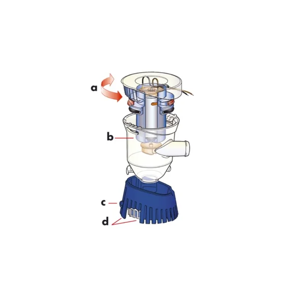 La base présente un double filtre (d) permettant de limiter l’obstruction complète de la pompe. Le nettoyage et le démontage sont faciles et rapides même si la pompe est installée dans un endroit difficile d’accès :