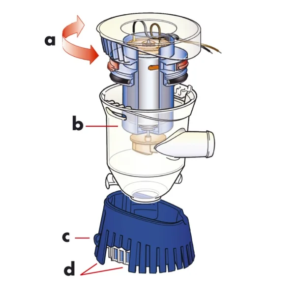 La base présente un double filtre (d) permettant de limiter l’obstruction complète de la pompe. Le nettoyage et le démontage sont faciles et rapides même si la pompe est installée dans un endroit difficile d’accès :