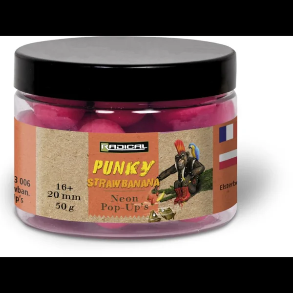 Pop up Radical carpe Punky Strawbanana neon pop up Un pop-up flottant rouge éclatant qui piquera l’intérêt des carpes les plus méfiantes jusqu’à la touche. Avec son arôme unique, même dans les eaux compliquées, cette bouillette déclenche des touches.