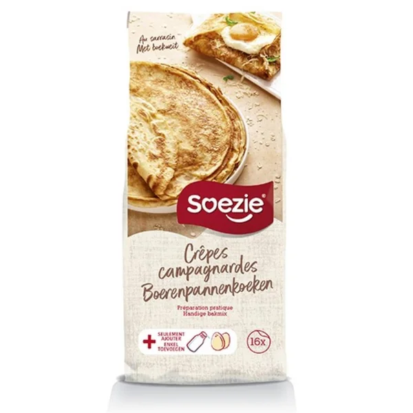 La préparation pour crêpes campagnardes de Soezie est conçue à base de farine de blé et de sarrasin, pour réaliser des crêpes consistantes et nourrissantes. Vous n’avez qu’à ajouter de l’eau et des œufs pour obtenir une pâte à crêpes parfaite. Conseils de préparation : Mélangez tous les ingrédients dans un récipient. Battez le tout jusqu’à obtention d’une pâte lisse. Faites fondre une noix de beurre ou chauffer un peu d’huile dans une crêpière. Versez-y une louche de pâte. Dorez la crêpe des deux côtés. Et voilà c’est prêt !