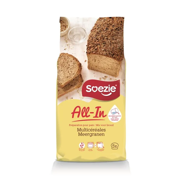La préparation pour pain multicéréales de Soezie est une préparation complète pour la réalisation d’un pain de 700 grs. Cette préparation contient du blé, de l’épautre, du seigle et des graines de lin. Préparation à la machine : versez 500 grs de préparation avec 300 mL d’eau et sélectionnez un programme qui dure entre 2 et 4h environ. Préparation à la main : Pétrissez 500 grs de préparation avec 300 mL d’eau jusqu’à obtention d’une pâte souple (env. 20 min.). Couvrez la pâte d’un film plastique et laissez-la lever pendant 30 à 40 min. Aplatissez la pâte et façonnez-la. Déposez-la dans un moule graissé. Laissez lever pendant 40 min sous un film plastique. Faites cuire pendant 30 à 35 min dans un four préchauffé à 220°C.