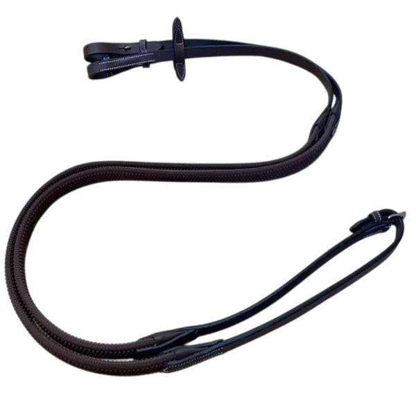 Les rênes caoutchouc 1/2 de Jump’In sont conçues pour offrir au cavalier un grip optimal tout en conservant la souplesse et la finesse de contact. Elles sont particulièrement appréciées en CSO, dressage ou travail quotidien grâce à leur équilibre entre sécurité, confort et précision. Cuir anglais pleine fleur Sedgwick, souple et durable, utilisé sur toute la partie cuir des rênes. Caoutchouc antidérapant couvrant la partie centrale : Souple, non abrasif, conçu pour améliorer l’adhérence, même sous la pluie ou avec des gants. Arrêtoirs de martingale en cuir cousu, solides et bien positionnés, empêchent la martingale de remonter et stabilisent les rênes. Bouclerie inox résistante et facile d’entretien. Largeur : environ 1,6 cm (1/2″) Les rênes caoutchouc 1/2 offrent une tenue ferme sans glisser, même en conditions humides