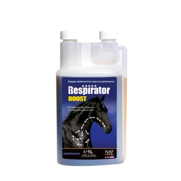 Le Respirator Boost de la marque NAF fournit un soutien nutritionnel précieux au système immunitaire des chevaux. Plus particulièrement aux muqueuses respiratoires et aux délicats vaisseaux sanguins capillaires qui entourent les poumons. La recherche montre qu’en complétant le régime alimentaire avec des antioxydants d’origine naturelle, les poumons du cheval peuvent bénéficier d’un soutien non négligeable. Respirator Boost en contient et c’est une solution concentrée. Des plantes telles que le gingembre, l’églantier et les bleuets, choisies pour leur soutien ciblé à la fonction pulmonaire. Il est également recommandé en prévention lors de contacts avec d’autres chevaux présentant un stress respiratoire. Les huiles essentielles de Respirator Boost aident à maintenir les voies respiratoires dégagées. Conditions d’utilisation : Mélanger à la ration ou administrer directement dans la bouche du cheval à l’aide d’une seringue buccale. Dose d’attaque : 60 ml par jour pendant 1 à 10 jours.